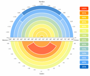 je nach Ausrichtung kann ein unterschiedlicher Ertrag erzielt werden. Nutzen Sie die Einstrahlungsscheibe um die prozentuale Verwertbarkeit der Solarenergie festzustellen.